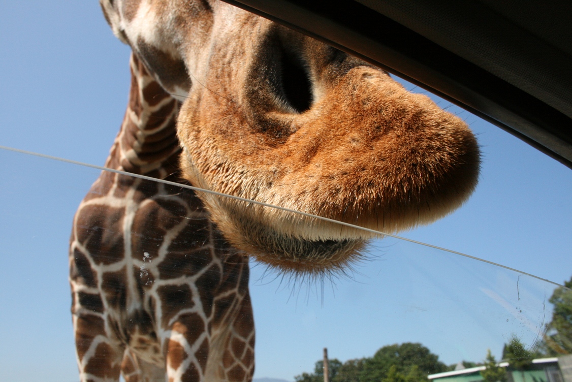車の窓にキリンがえさをもらうために近づいてきた時の写真です。